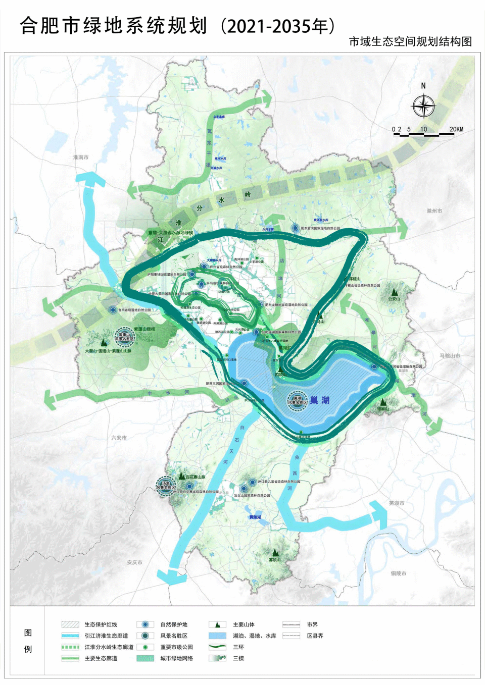 规划以“让巢湖成为合肥最好的名片”为根本遵循,以“城湖共生、城园交融、全民共享”为核心逻辑,构建“大湖为芯、山河为脉、绿环为链、全域为网”的高品质城乡绿地系统。