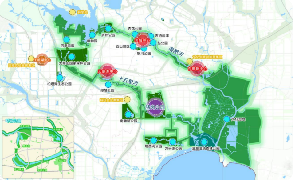 城市活力绿环由南淝河、十五里河等主要水系,以及大蜀山、骆岗公园、天鹅湖、滨湖湿地森林公园等重要生态节点构成;
