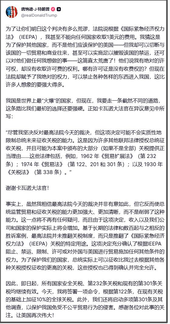 特朗普在21日凌晨2点37分就发帖宣布称:“即日起,所有国家安全关税、第232条关税和现有的第301条关税均继续有效。今天,我将签署一项命令,根据第122条,在现有关税的基础上加征10%的全球关税。此外,我们还将启动多项第301条及其他调查,以保护我国免受不公平贸易行为的侵害。”