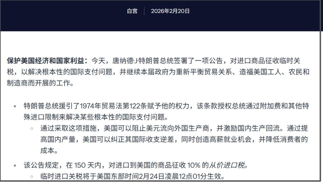 所以,白宫很快就发布了一条行政令,引用122条款,在 150 天内,对进口到美国的商品征收10%的关税。