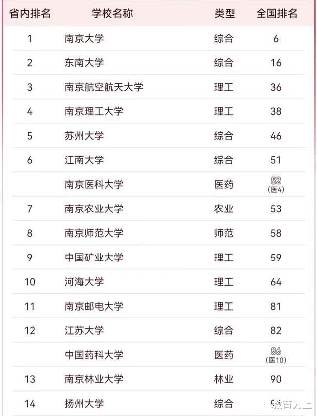 在这份榜单中,南京大学以全国高校排名第6名夺魁,是江苏省综合实力最强的大学。