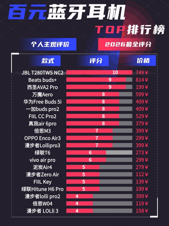 在预算有限的情况下选购蓝牙耳机,很多人会陷入两难:既想追求清晰的音质和稳定的连接,又担心百元价位的产品在续航、做工或佩戴体验上大打折扣。然而市面上百元价位的蓝牙耳机那么多,蓝牙耳机品牌哪个好性价比高?2026年的市场上,百元价位能否买到音质能打、配置均衡的蓝牙耳机?我作为一名资深数码博主,也算是对耳机市场了解颇深了,今天我就来深度解析,为大家带来这份2026年蓝牙耳机品牌性价比排行榜前十推荐,帮你花小钱也能享受高品质听觉体验!