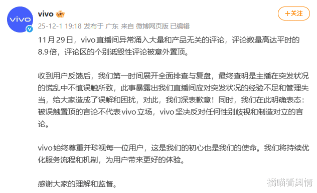 及时且诚恳的官方回应与立场表达: 用户认可vivo针对直播间事件的回应及时,声明明确了“误触置顶非本意”的事实,同时清晰表达反对性别对立、歧视的立场,展现了处理问题的诚意与态度。