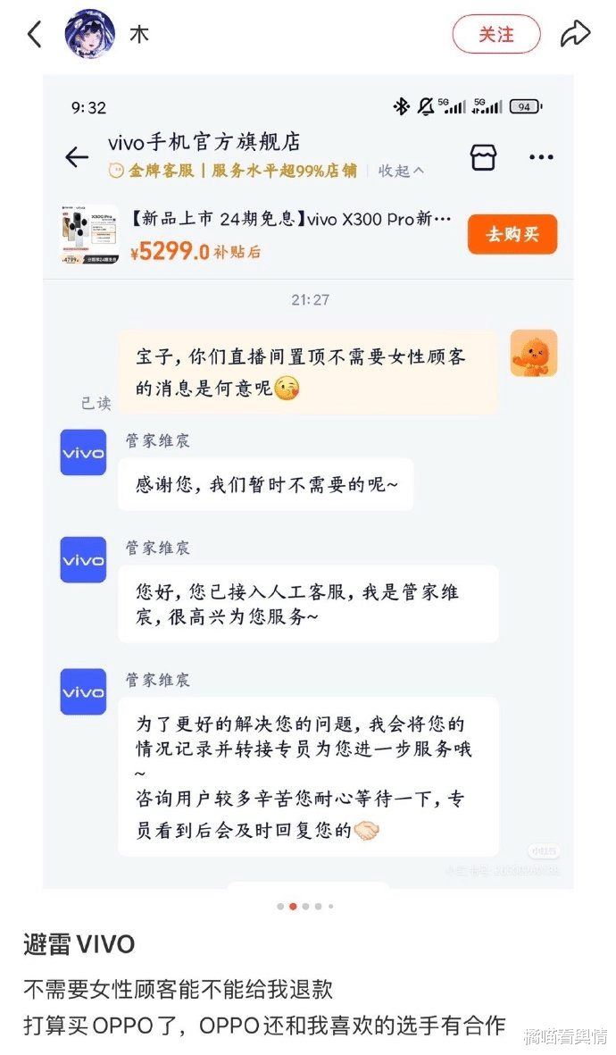 11月30日,“vivo被曝直播间置顶不需要女用户评论”话题登上热搜,相关讨论迅速扩散至微 博、抖音、小红书等多平台。