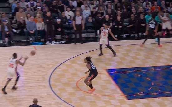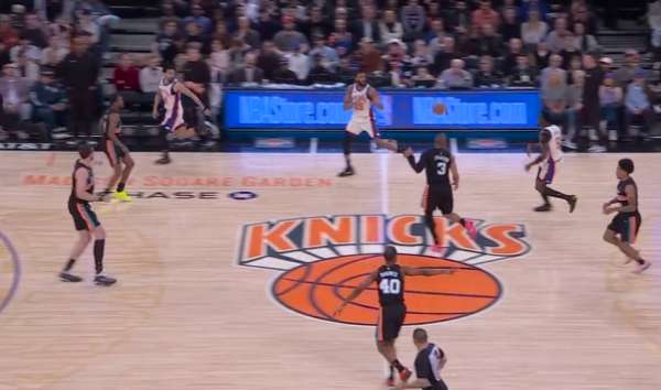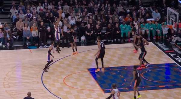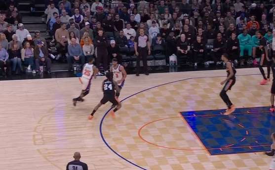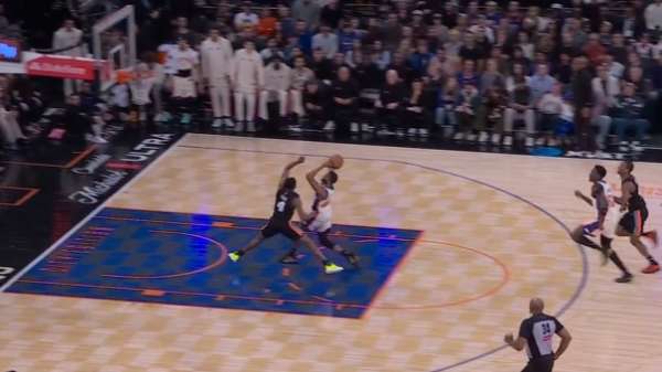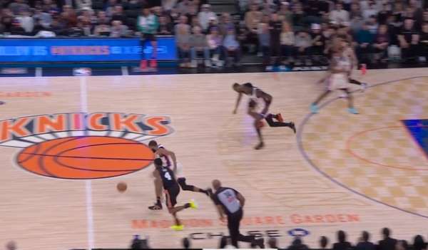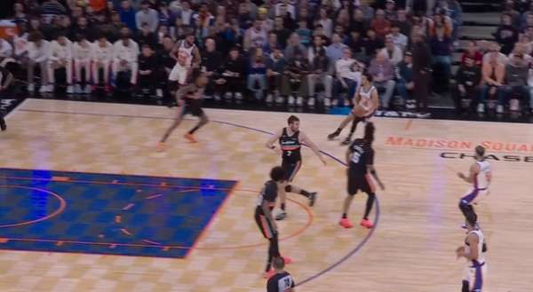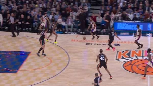 持球推进至右翼后使用一记推球变向躲过福克斯刷卡,