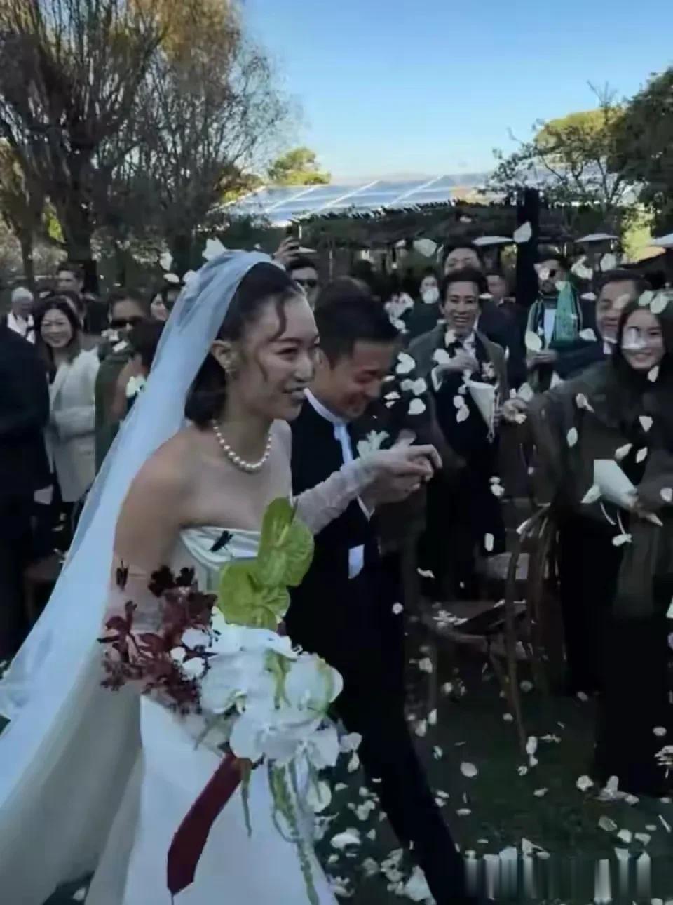 女方爸爸将女儿亲手交给霍启仁后,仪式正式开始,新郎新娘携手走了上来,洁白的花瓣雨代表着大家的祝福,撒在他们身上。