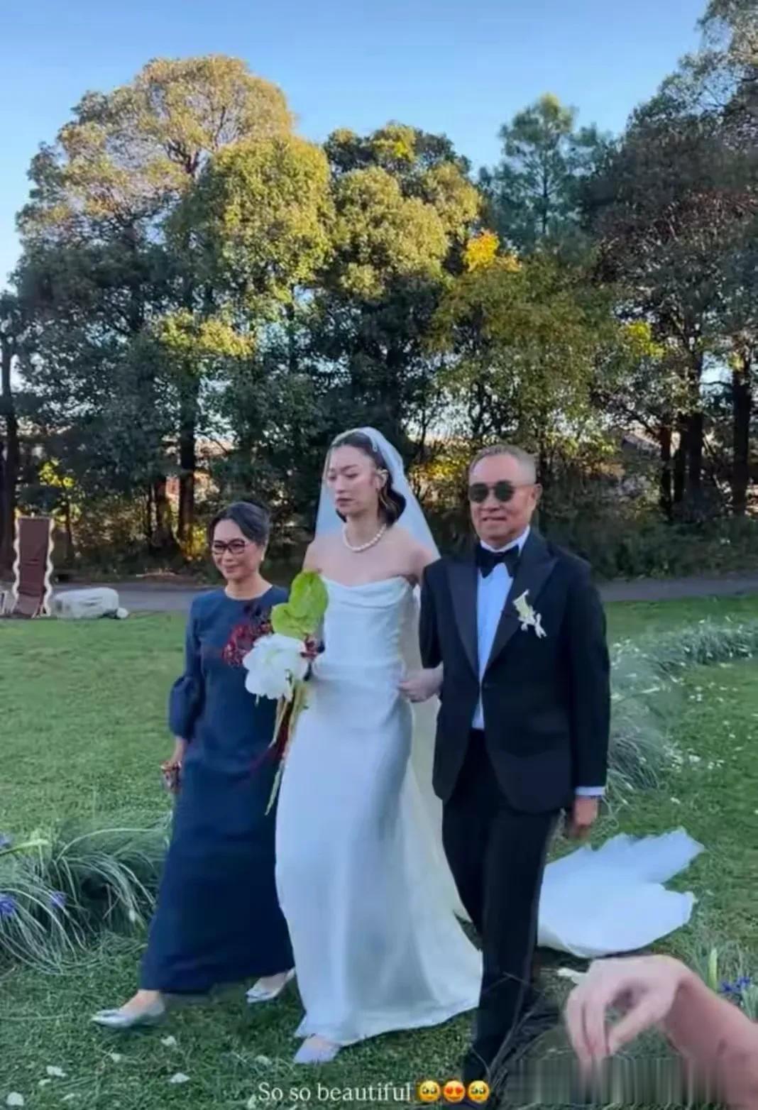 新娘由女方父母带着入场,身穿抹胸婚纱的她,身材高挑,很有超模的气质。她的父母看上去也很儒雅。