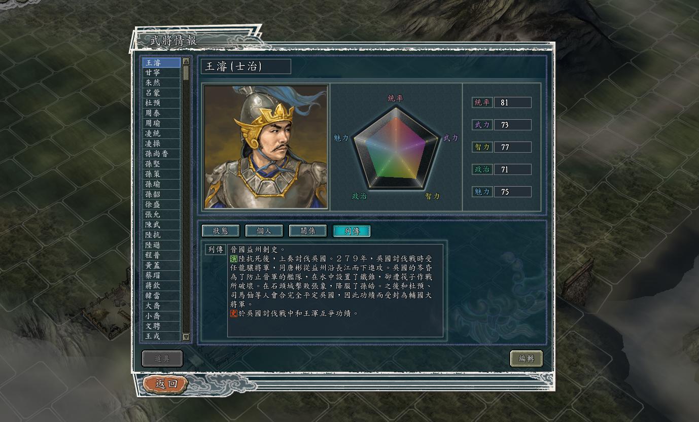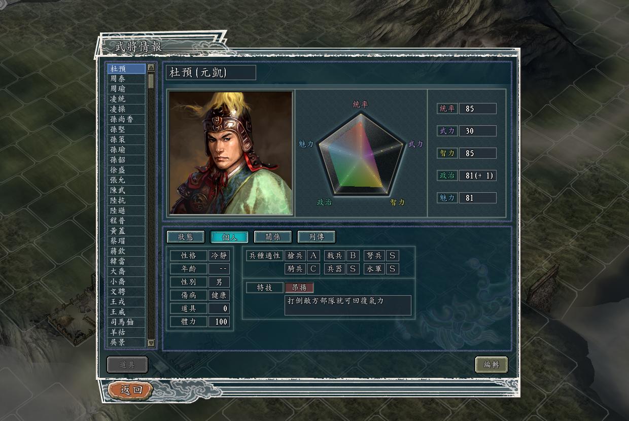 再看后几位,杜预、王濬、王浑这三位做的共同一件大事,就是晋灭吴大战。吴国最强的是水战,即便后期S级、A级的水战将领也多得很,所以能击败如此强大水战对手,只能说明自己更强,这三位水战S级没毛病。至于如何练就的,应该归功于长期努力学习积极备战,在伐吴之前,三个人在三个不同方向向吴国积极备战。王濬在益州长期训练水军,杜预镇守襄阳更是水战重地,王浑的徐州紧邻建业方向。