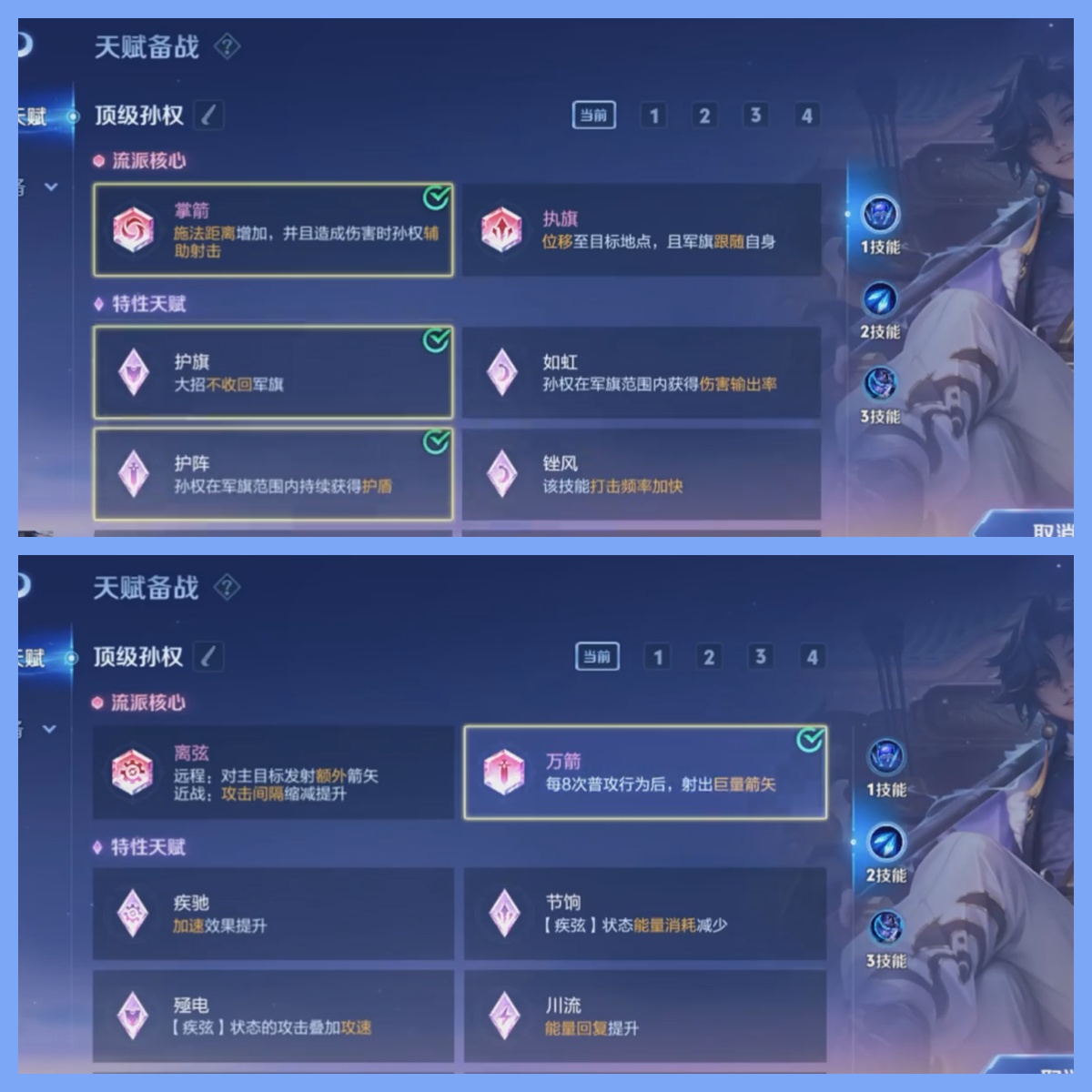这里推荐大家试试孙权,在这个模式里堪称 T0 级别的英雄。在选择天赋方面建议选择“万箭流”玩法,搭配“掌箭+护旗”的天赋核心,远程拉扯清理清怪和打 boss 的效率都很不错。