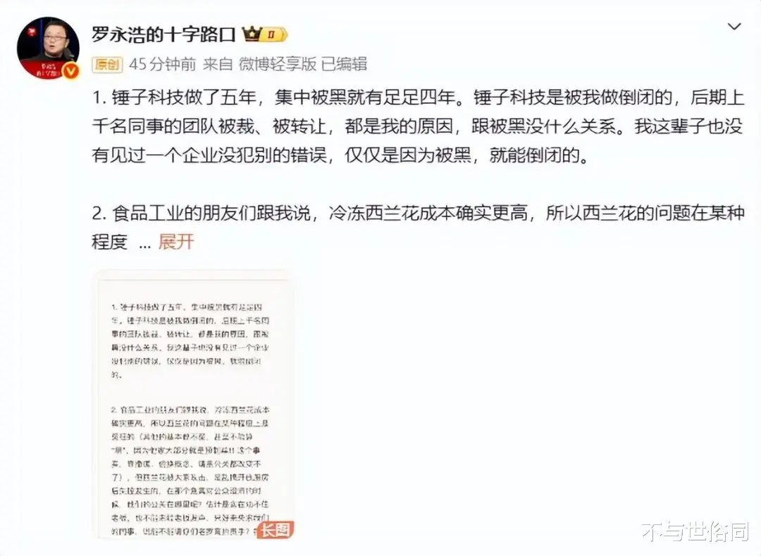 罗永浩破天荒的第一次在互联网上承认“冤枉”了贾国龙的西兰花。