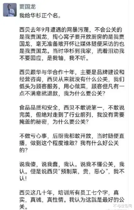 不过,贾国龙没有妥协,依然没有“公关”,因为西贝贾国龙说“从来就没有什么公关,我们低头为顾客服务,用心做菜,顾客但凡有一点不满意就退款,我为什么要公关?”