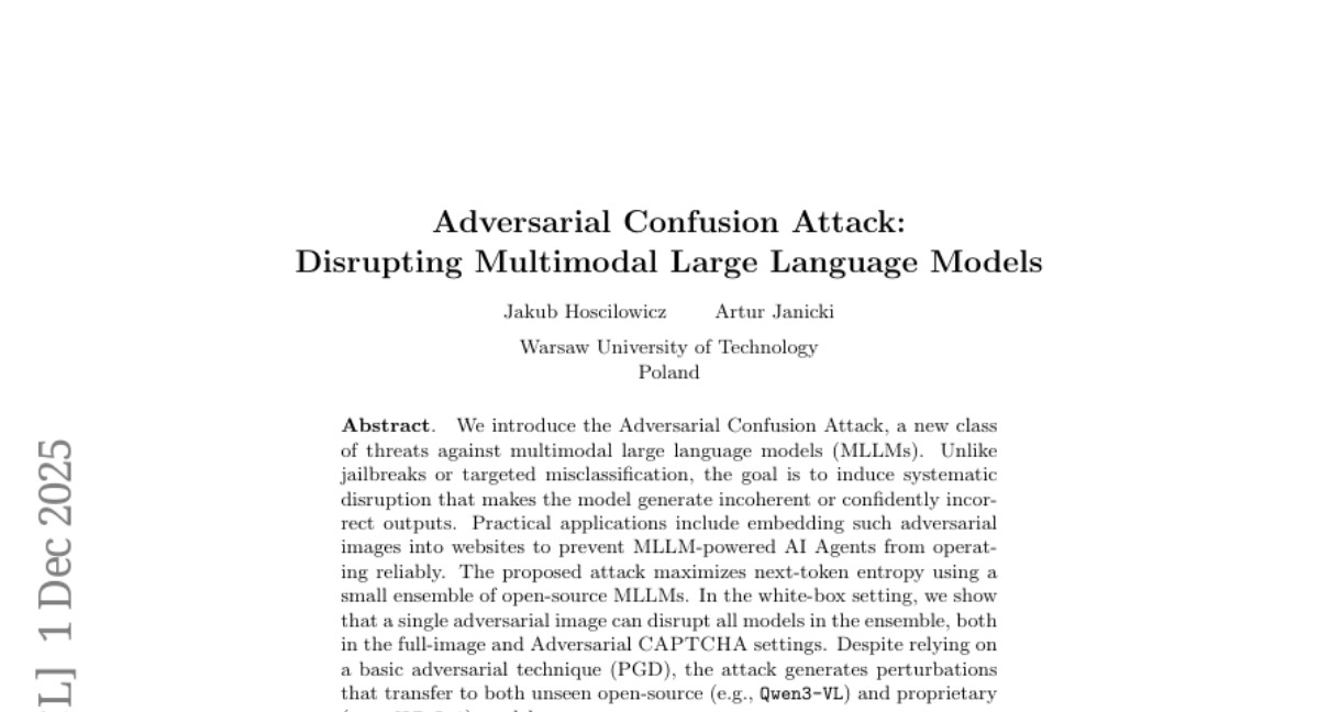 华沙理工大学的雅库布·霍西洛维奇和阿图尔·雅尼茨基在2025年12月发表的这项研究(论文编号:arXiv:2511.20494v3),揭示了现代多模态大语言模型存在一个令人担忧的安全漏洞。这些被广泛应用的AI系统可能被一种名为"对抗性混淆攻击"的新型威胁轻易击败。