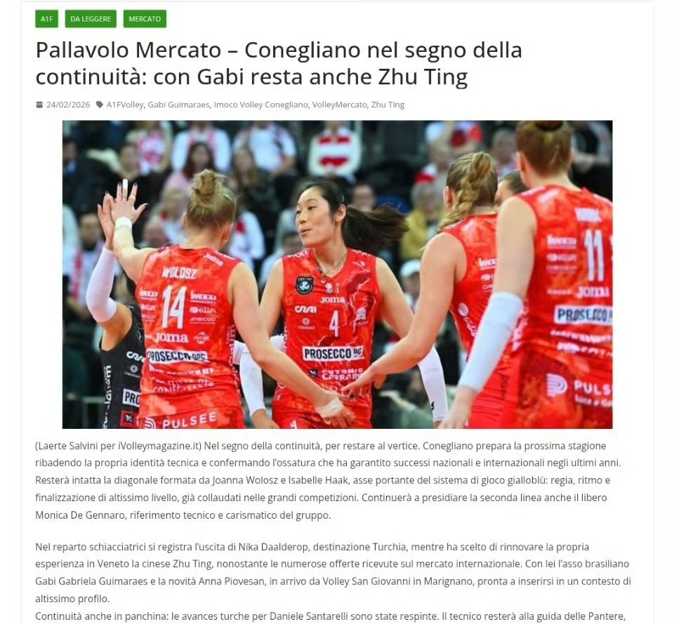 根据意大利媒体的报道,朱婷新赛季还将继续留在科内利亚诺女排,同时朱婷也拒绝了多队的报价,意大利媒体的可靠性非常高,这说明朱婷还是比较抢手,也不会去土耳其联赛,更不会在状态这么好的情况下选择退役。同时二传沃洛兹、主教练桑塔雷利都会留队,所以新赛季科内利亚诺女排的主力阵容基本上保持不变,只是在主攻的替补阵容上会发生变化,本赛季庄宇珊的队友皮奥维桑将会替代尼卡加盟球队,同时副攻位置上也会发生一些调整变化。
