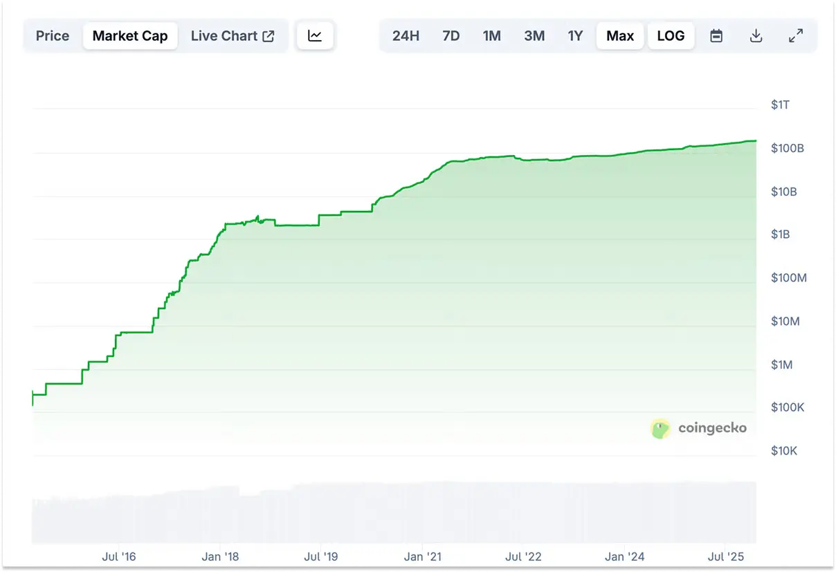 以对数尺度计的 USDT 市值增长(看看 2016-17年)