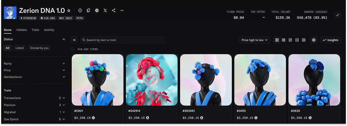 当 Zerion 推出钱包时,他们创造了一个 Zerion DNA 虚拟形象,这是一个动态的 NFT,会根据你钱包中持有的资产而不断演变。你钱包里的钱越多,NFT 就越“先进”。很多人开始向 Zerion 钱包汇款,长期以来他们的 NFT 是主网上第二大 NFT 收藏(仅次于 ENS),拥有超过30万持有者。