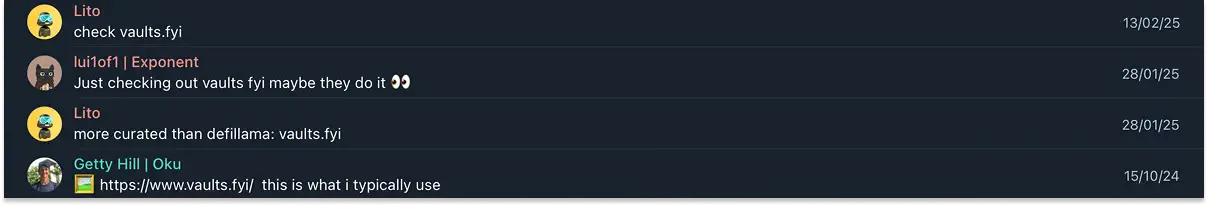 由于聊天室充满了 DeFi 老将,我们经常交换不同加密产品的笔记。每当有人问有没有刷 APY 的工具时,大家都会提到 Vaults.fyi: