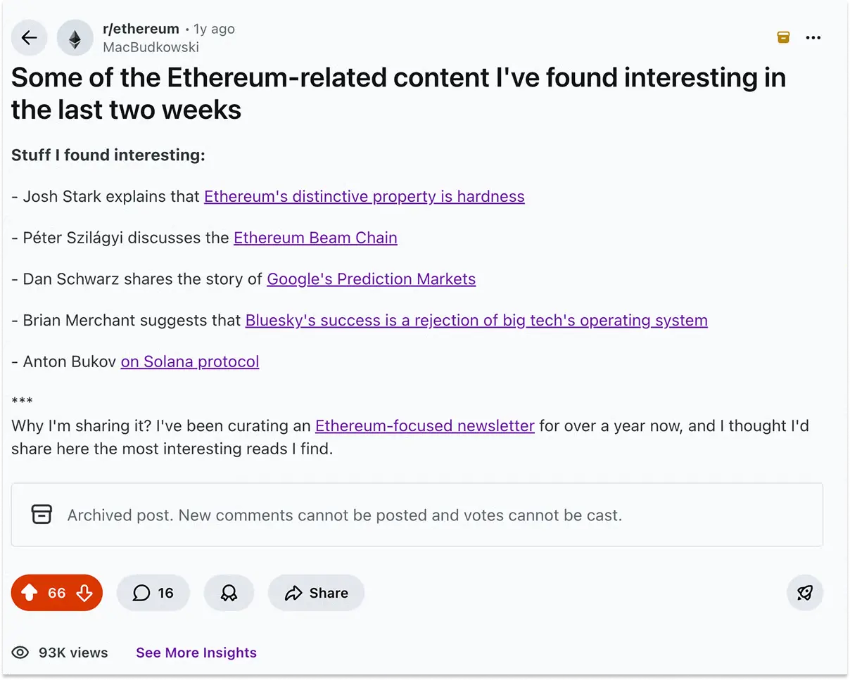 在 r/ethereum 的逻辑上,这些 Reddit 用户喜欢讨论以太坊内容。既然他们关心去中心化,可能会对 Kiwi(一个去中心化的黑客新闻/Reddit 类应用)感兴趣。所以我每周都会在那里分享回顾帖子 ,并试图邀请这些人订阅我们的通讯,后来会向他们介绍这个应用。