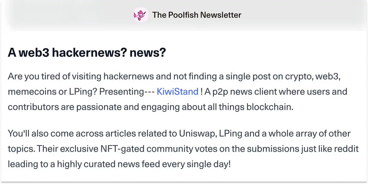 我们在多份通讯中被提及。其中包括专注于 Uniswap LP服务商的 Poolfish。