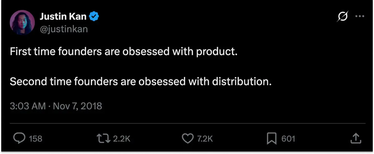 这也解释了为什么仅靠发 T 恤和在推特上发“gm”的营销策略往往以失败告终。正如硅谷那句名言:你需要好的产品加上好的分销才能获胜。