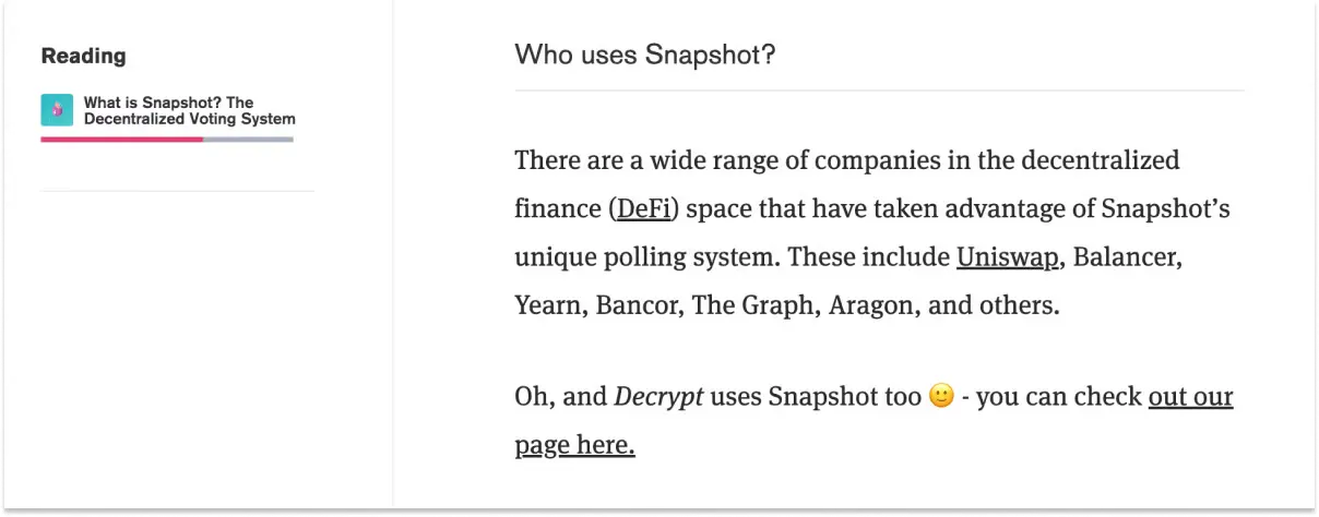 这篇 2021 年的 Decrypt 文章引导新用户加入 Snapshot,是因为他们想激活自己的社区。这是 Snapshot 产品驱动增长的众多例子之一。