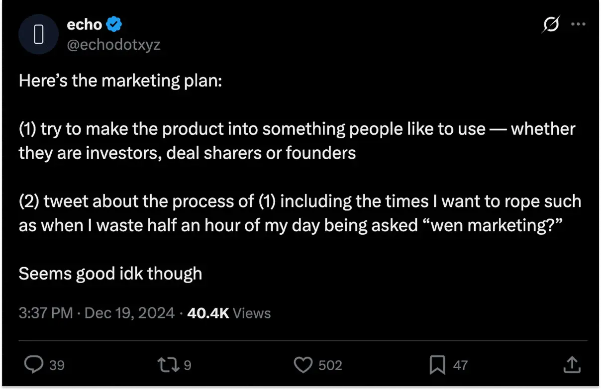 于是他在自己的私人和项目资料中公开了内容,并在他的 Substack 上描述了早期资金问题(Echo 解决了这个问题 )。此外,群策展人(通常是知名的加密投资者)会向想要共同投资的人发送 Echo 邀请码,帮助新用户加入应用。