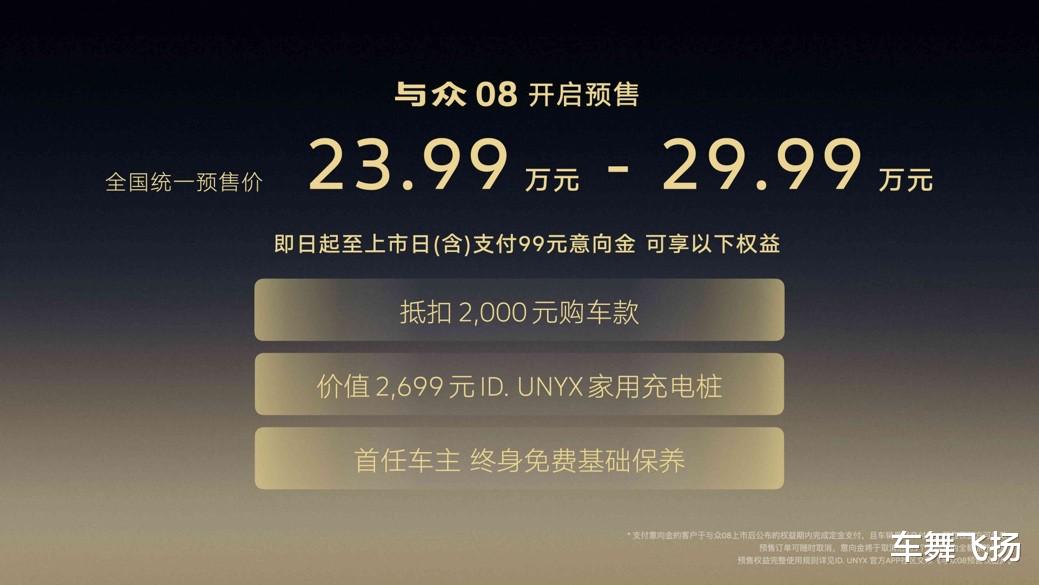 【2026年3月26日,合肥】作为强大产品攻势的序幕,今日,金标大众家族全新成员——首款全时互联全尺寸纯电SUV与众08在合肥完成首秀,并同步开启预售,预售价格为23.99万元-29.99万元。新车推出了限时预售权益。即日起,用户支付99元意向金,即可尊享三重礼遇:99元意向金直接抵扣2000元购车款;首任车主终身免费基础保养;赠送价值2,699元ID.UNYX家用充电桩。目前,与众08已陆续进入金标大众门 店,客户可于门店预约试驾体验。