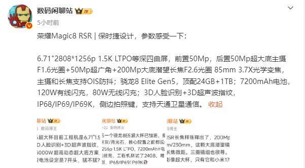 另外,日前,有数码博主还曝光了荣耀Magic8 RSR的全面配置参数和真机谍照图。据爆料称,该机将采用2808*1256p分辨率1.5K的6.71英寸LTPO等深四曲屏,支持3D人脸识别+3D超声波指纹,搭载高通第五代骁龙8至尊版处理器,顶配24GB+1TB存储组合,内置7200mAh青海湖电池,支持120W有线闪充和80W无线闪充。