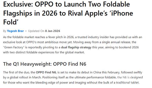 近日,有海外爆料达人爆料称,@OPPO 今年很可能将打破大折叠手机“一年一更”的节奏,首次开启“双旗舰并行”模式。很可能Find N6与Find N7将在同一年推出,分别切分性能发烧友与高端商务/果粉市场。据业内人士表示,OPPO此次的双机布局,不仅是对自身产品线的扩充,更是面对苹果入局压力下的主动出击。