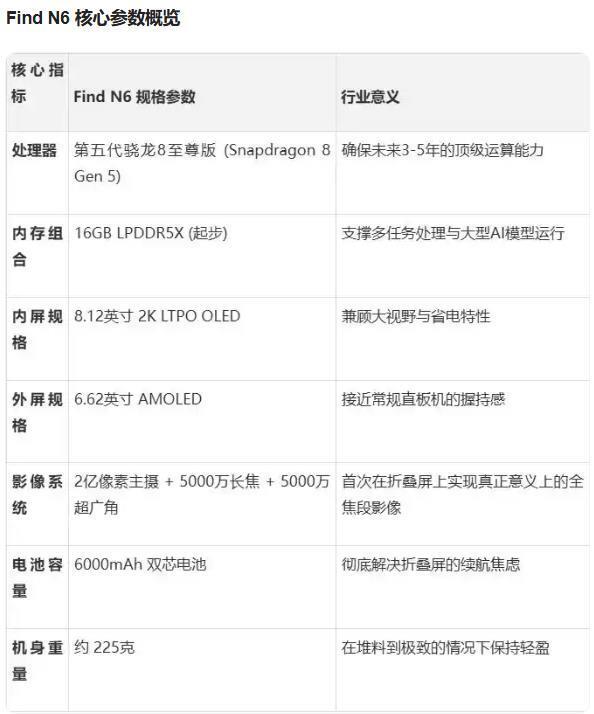 根据爆料,Find N7会彻底抛弃传统折叠屏的长条形态,采用“小外屏+阔内屏”的设计。折叠起来的时候,外屏小巧,单手操作毫无压力;展开之后,内屏的宽高比接近4:3,像一本随身携带的小笔记本,所以叫“宽书本式设计”。虽然形态变了,但据悉Find N7的核心配置会直接照搬Find N6的旗舰规格。第五代骁龙8至尊版处理器、高规格双屏、2亿像素主摄+双5000万影像系统、6000mAh大电池+80W有线快充+50W无线充电,一个都不会少。