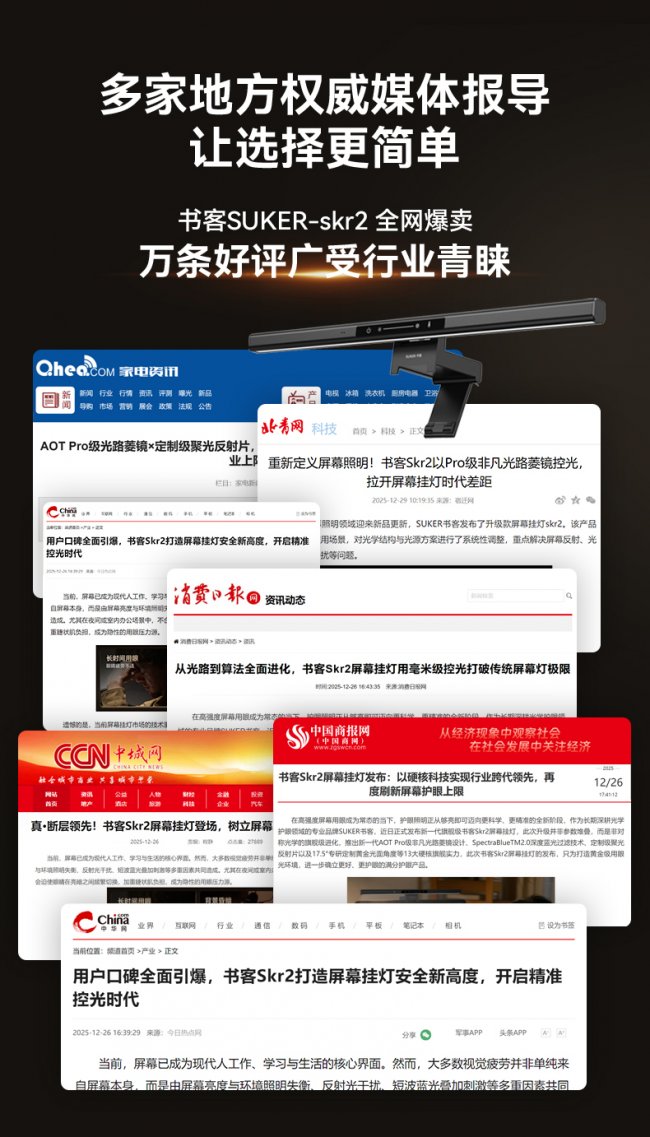 媒体将书客誉为“仅有它能媲美明基、松下等一众高端屏幕灯”,哪怕不做广告推广,仍然凭借口碑征服众多宝妈博主、机构与消费者,常年出口于欧美等地,罕见得到了欧盟多国认证、入选品牌强国优选工程,CCTV央视推荐以及专业医学团队——丁香医生的力荐等。下图为suker书客品牌各种权威机构认证图: