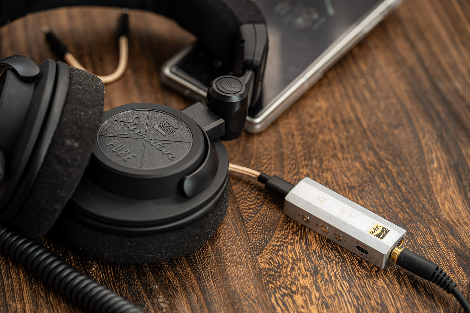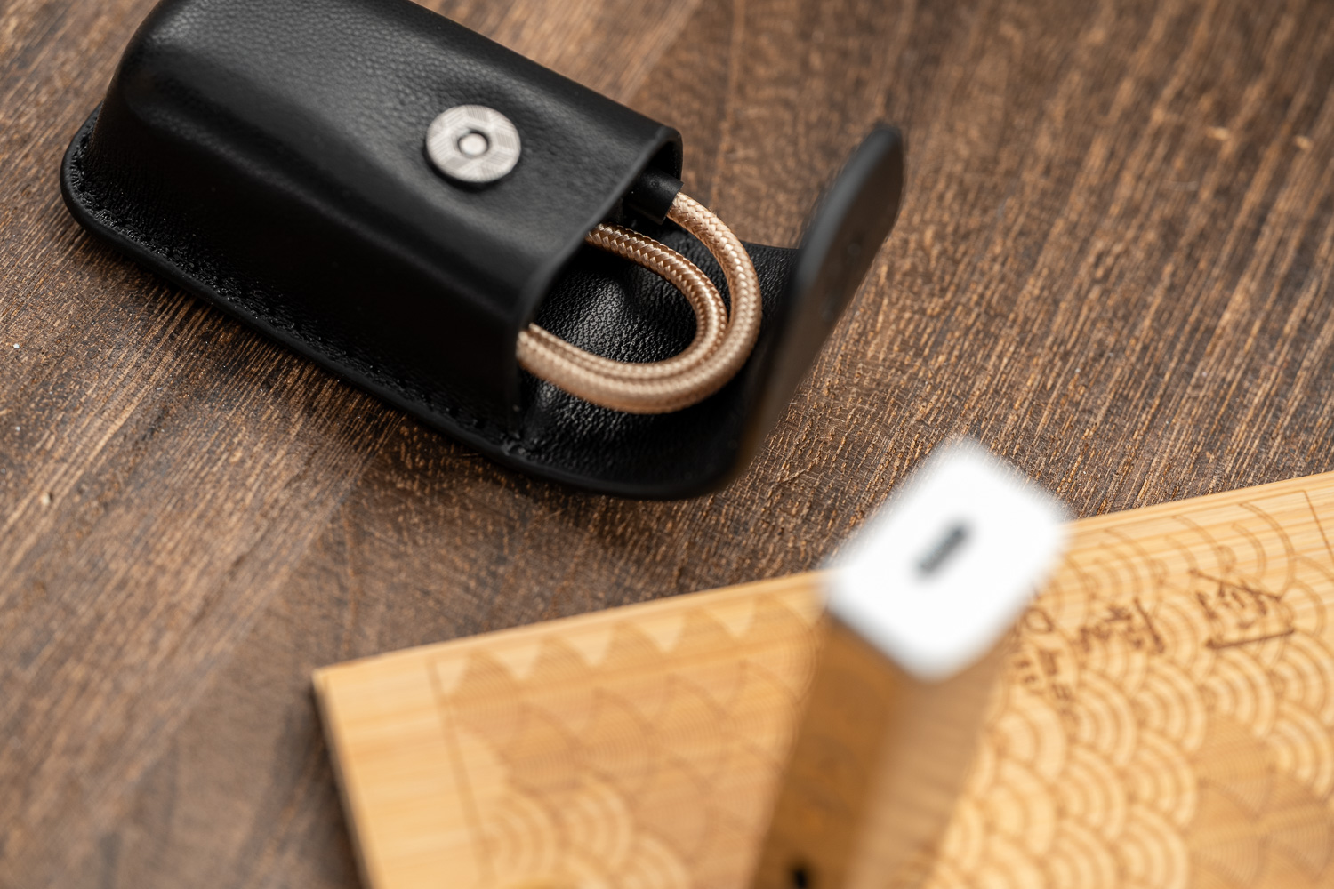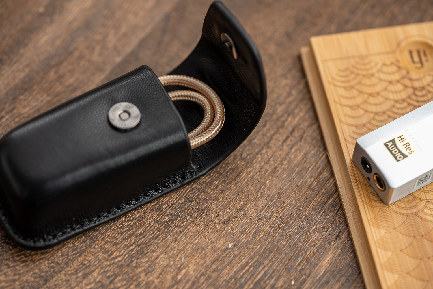 剑圣依然是标配了iFi家这个标志性的收纳小皮盒,可以容纳两根原配线和一个USB-A转接头,我一直认为这是一个不错的原创设计,也推荐友商们可以借鉴学习一下,美观度和实用性都不错。iFi的这两根原配USB线用料扎实、屏蔽也做的比较好,我以前经常拿来给别的小尾巴做“升级线”用。