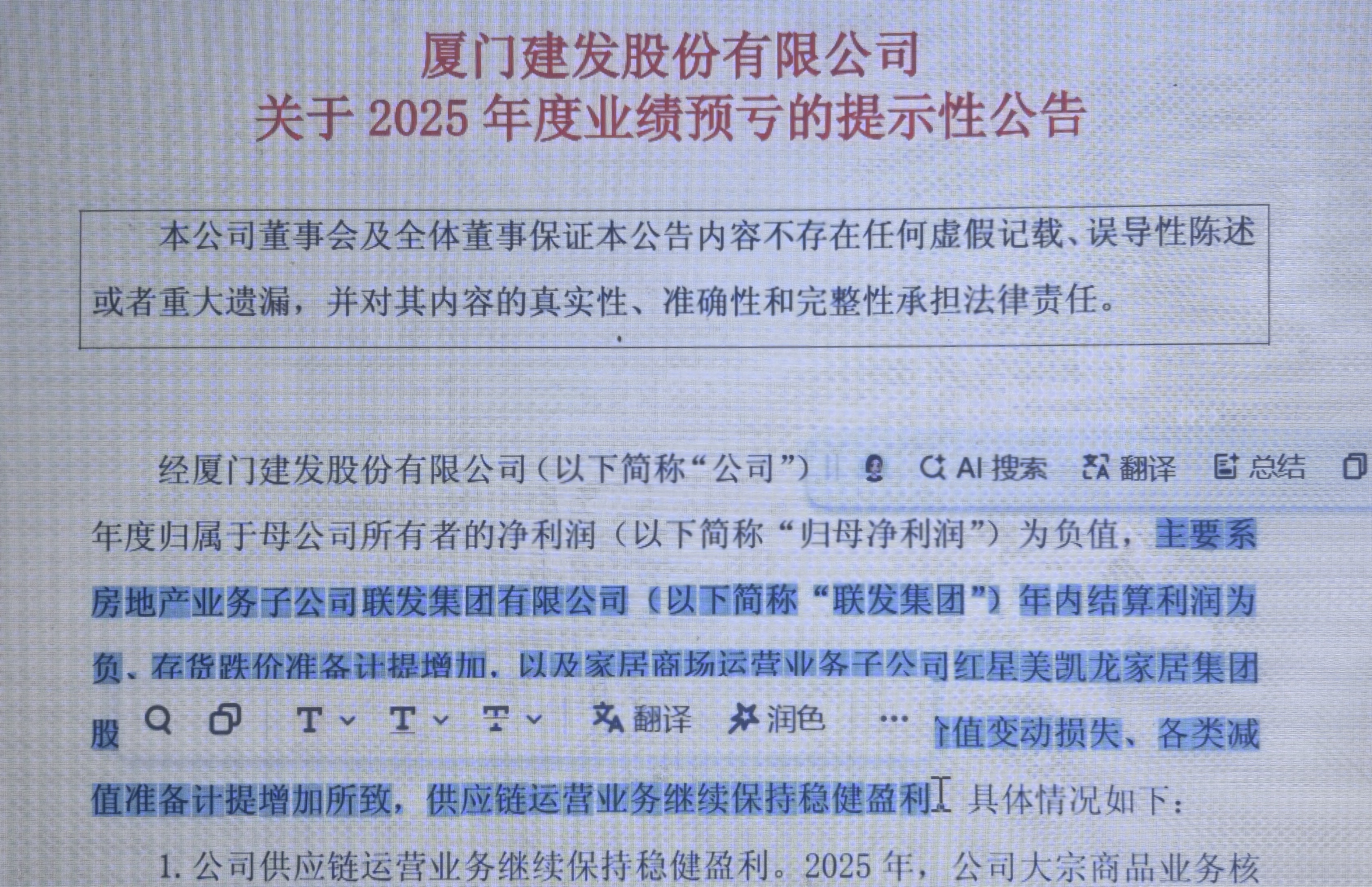 1月16日晚发布公告,经财务部门初步测算,预计2025年度归属于母公司所有者的净利润为负值,主要系房地产业务子公司联发集团有限公司年内结算利润为负、存货跌价准备计提增加,以及家居商场运营业务子公司红星美凯龙家居集团股份有限公司投资性房地产公允价值变动损失、各类减值准备计提增加所致,供应链运营业务继续保持稳健盈利。
