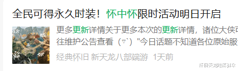 怀中怀半年一更,这是之前原始服开服时的承诺,开服时策划表示回归原始玩法去繁就简主打减负是原始服的诞生初衷,也是吸引咱们现在许多原始服玩家的点。到目前,除了之前的扫荡功能添加回来外,咱们好像确实没听到有什么大的更新动作。不过就在昨天,原始服更新上线了新活动。