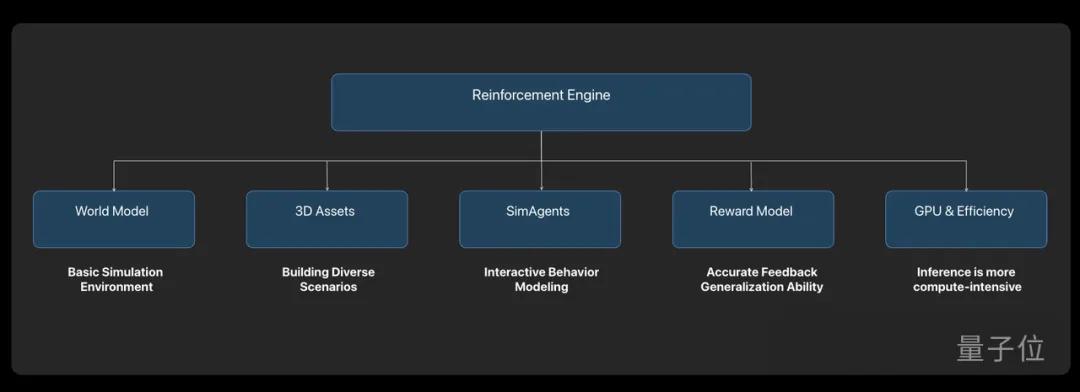 最后一层应用是理想认为最具挑战性的强化学习世界引擎,这一层让模型能在训练环境中自由探索并获得反馈,主要有五大关键因素:
