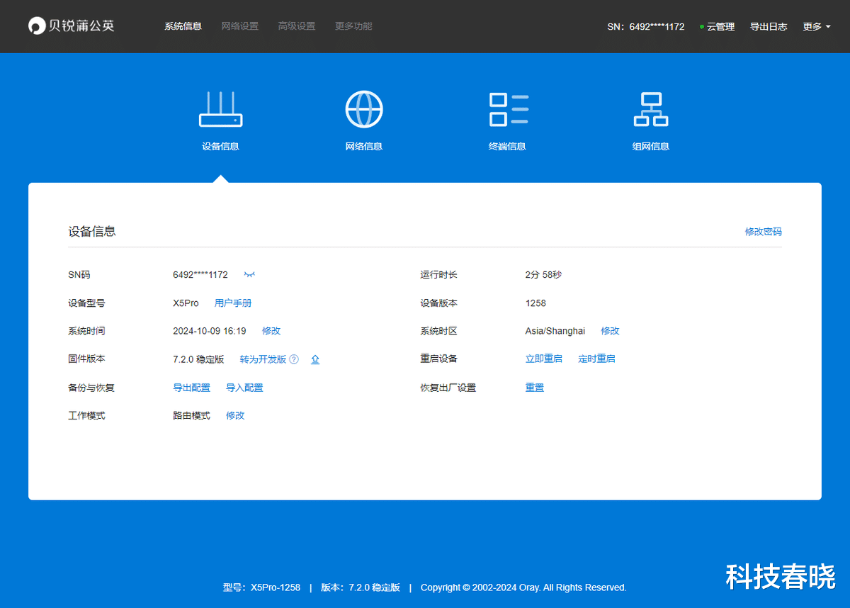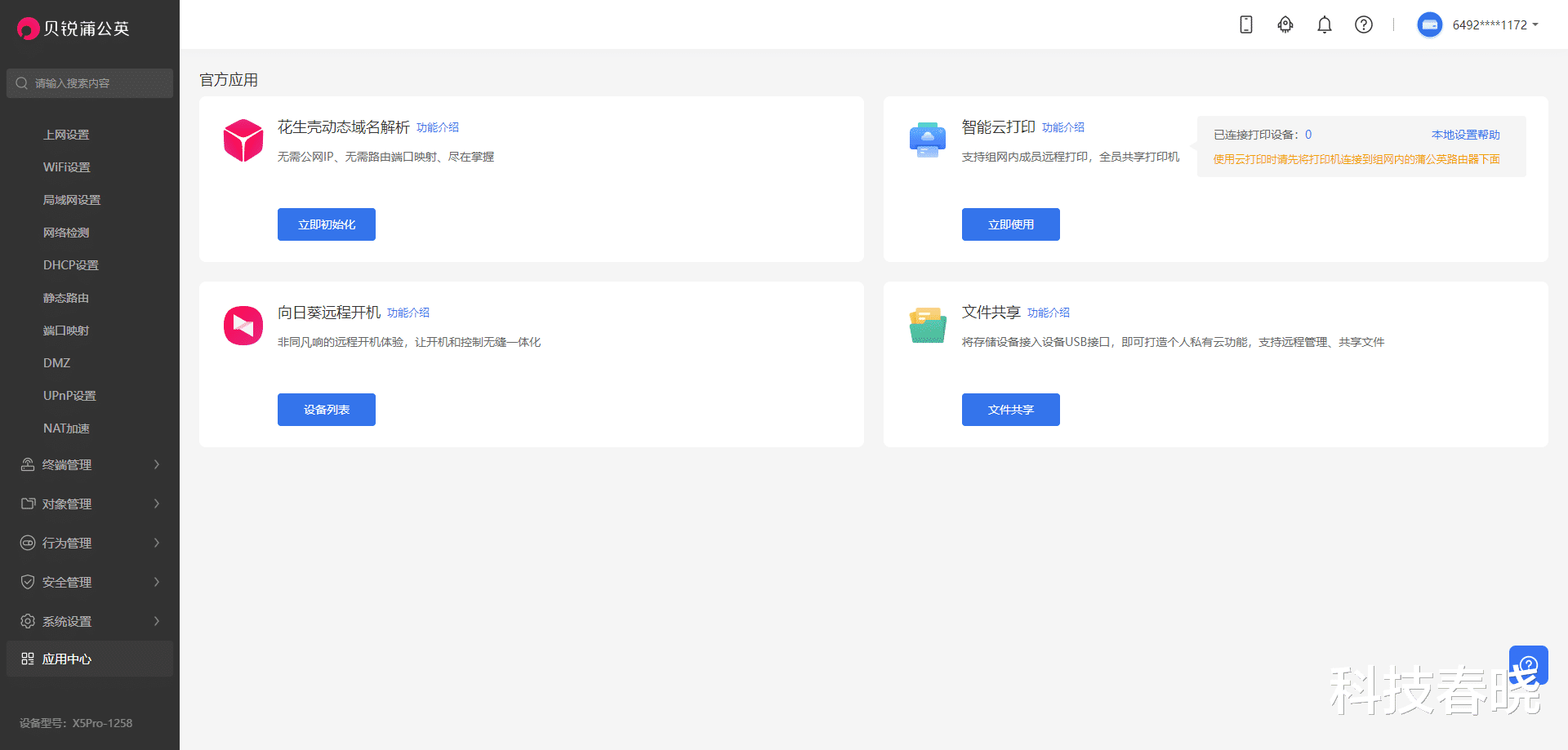 接着咱们来看蒲公英X5 Pro的云管理功能,只要设备接入网络,就可以随时通过SN和设置好的管理密码进行远程设置,这里包括智能组网、终端管理、对象管理和行为分析等。