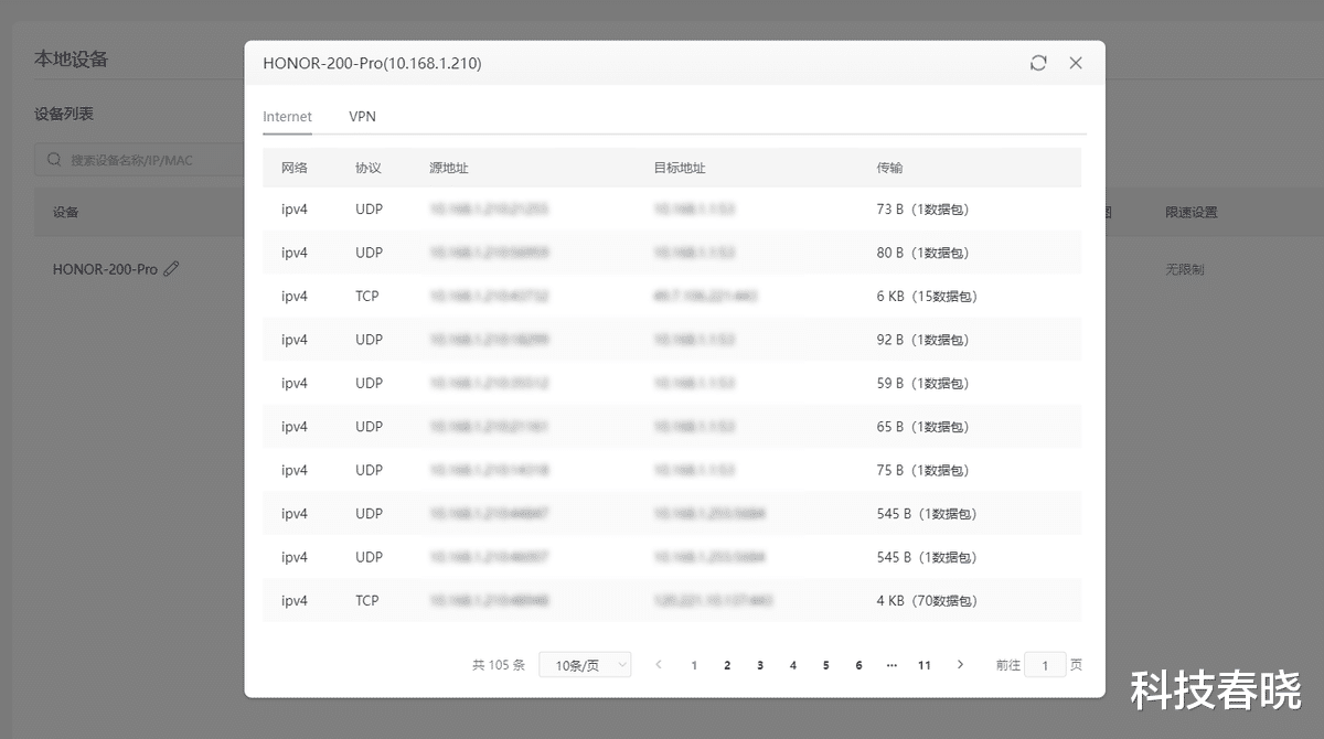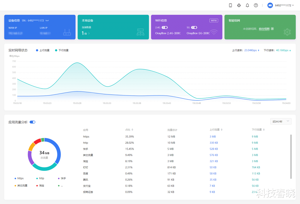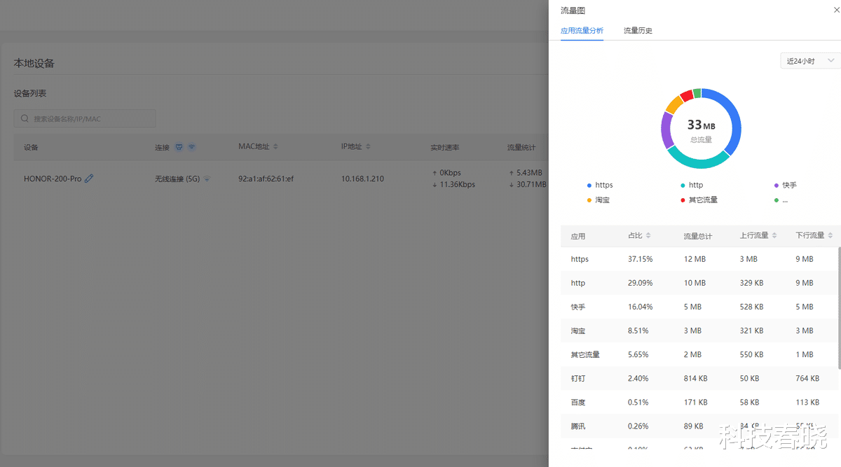 终端管理功能对企业路由也很重要,除了常规的上下行流量限速,蒲公英X5 Pro还能监测和限制每一个终端用户的网络使用,这里包括 近24小时内的详细应用流量分析(具体应用、http、https等)和流量历史,图形化界面很直观。