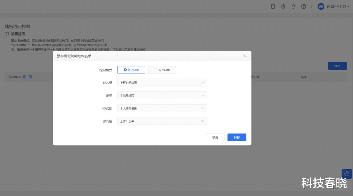 在此基础上,就可以为不同员工划分网络权限,比如拒绝访问内部局域网(IP组)、上班时间不可访问的摸鱼网站,如电商、娱乐平台等(域名组)、受此功能限制的设备(MAC组)及生效时间,功能相当强大。