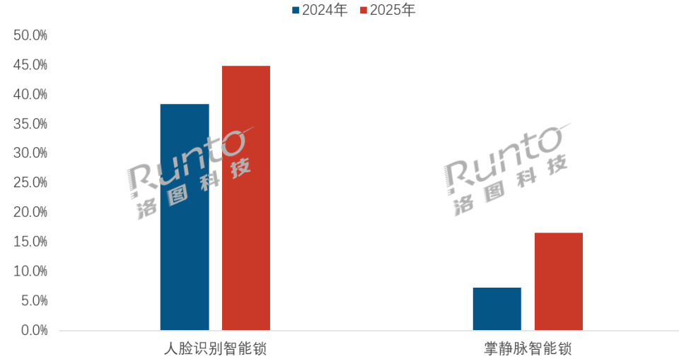 生物识别技术是智能门锁的主流解锁方案,其中人脸识别与掌静脉识别的渗透率正在快速提升。根据洛图科技(RUNTO)线上全渠道数据显示,2025年,搭载这两类识别方式的产品销量占比分别为44.9%和16.5%,较2024年分别提升了6.6和9.2个百分点。