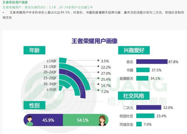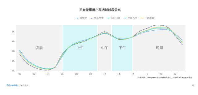 大数据机构TalkingData数据报告显示,从王者荣耀的两大用户群分布看,学生族占24.5%,其中,大学生占21.8%,女大学生占11.6%,中小学生占2.7%;上班族占68.7%,其中,年轻白领占45.3%,中年人士占19.3%,“老顽童”占3.5%。整体看,王者荣耀的大学生、中年人士高于移动游戏用户整体。只是从不同用户群体的活跃时段分布看,整体上中午以及晚间的17-22时是用户比较活跃的时间段,其中,年轻白领和大学生在上午时段相对活跃,中小学生则在中午以及晚间时段较为活跃。