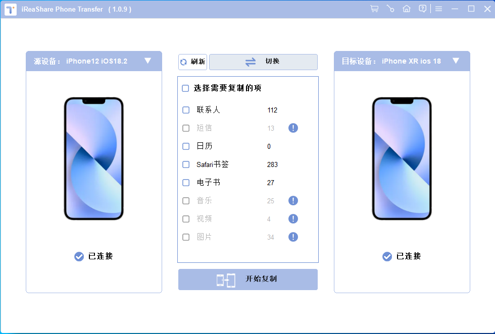 在电脑安装 iReaShare Phone Transfer。用两根 Lightning 线分别连接旧 iPhone(源机)与新 iPhone(目标机),点击“信任”。程序自动识别设备,勾选需要迁移的数据类型,点击“开始复制”。