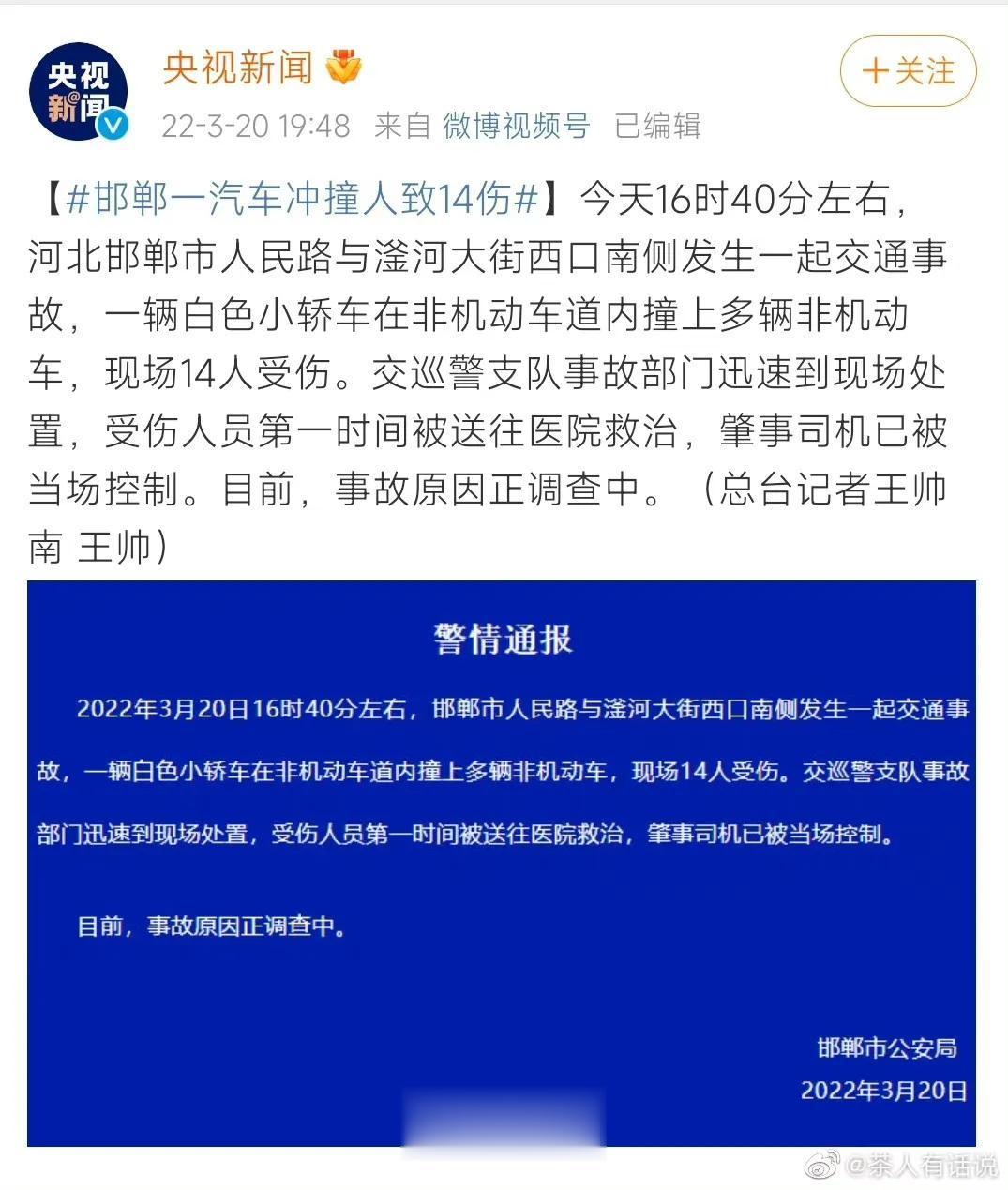 邯郸这是怎么了? 去年3月份一次轿车冲向人群致使多人受伤。 今年3月的最后一天又是一辆轿车致使多人受伤。 我人生第一次小车祸,也是在邯郸发生的。 20年的国庆,我从北京回邯郸看房,和我朋友,还有一个两个中介开了一辆小车驾驶在丛台东路上。 刚过万浩红玺城没多少米,就在丛台东路和赵王大街的十字路口。我们发现那个路口两起车祸,坐在车上中介就和我们说,看,一个路口两起车祸。 可谁知道,司机也稍微分神了,去看那两起车祸了,但是经过那个路口时是绿灯刚转黄灯。 然后,被一辆渣土车抢灯,直接把前轮胎撞掉下来了,水箱报废。坐在副驾驶的朋友心有余悸,因为但凡小车再快点,他那天就住院了。 晚上和邯郸的朋友一块聊天的时候,就说这个事,她毕业以后一直在邯郸,对于邯郸有些机动车抢灯灯行为,屡见不鲜,因此发生的车祸,更是目睹了好几次。 一座三千年没有改名的城市,一座历史名城,一座赵国古都,有着娲皇宫、广府古城两处5A景区,15处4A景区的老城。 没有因为名胜古迹上过热搜,没有因为网红经济上过热搜,反而却接连两年因为这种人为车祸上了热搜,到底是哪里出了问题? 你别说外地人还想不想来你们这旅游了,就连我这本地人看到这种新闻,我都害怕。朋友圈已经好几个朋友发,以后不出去吃饭了,又活了一天之类的话了。 今天是个周五,视频里的受害者有几个骑着电车,他可能刚下班,也可能是和朋友一块刚吃完饭,本来就是安安心心过个周末,他有什么错?