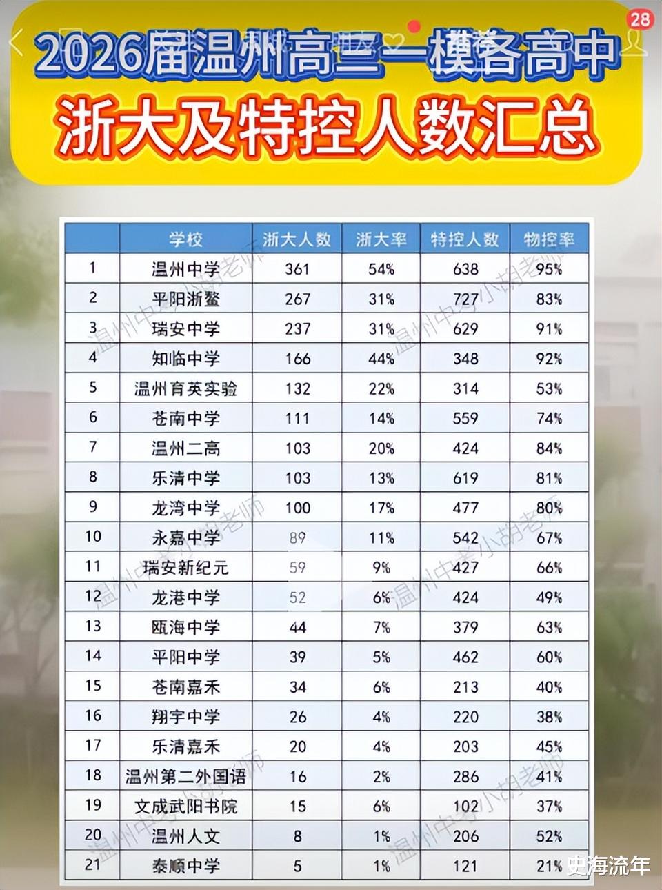 温州二中和乐清中学均为103人排名并列第七位。龙湾中学100人,排名第九位。永嘉中学89人,排名第十位。瑞安新纪元59人,排名第十一位,龙港中学52人排名第十二位。