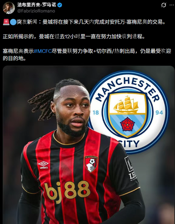 冬季转会窗尚未正式开启,但英超的暗战已硝烟弥漫。本赛季在伯恩茅斯迎来爆发式表现的加纳边锋安托万·塞梅尼奥,已成为转会市场的风暴眼。一场涉及曼城、曼联、利物浦、切尔西、热刺等多支豪门的争夺战,剧情逐渐明朗——所有迹象表明,曼城已在竞争中占据压倒性优势,一笔重磅交易官宣进入倒计时!