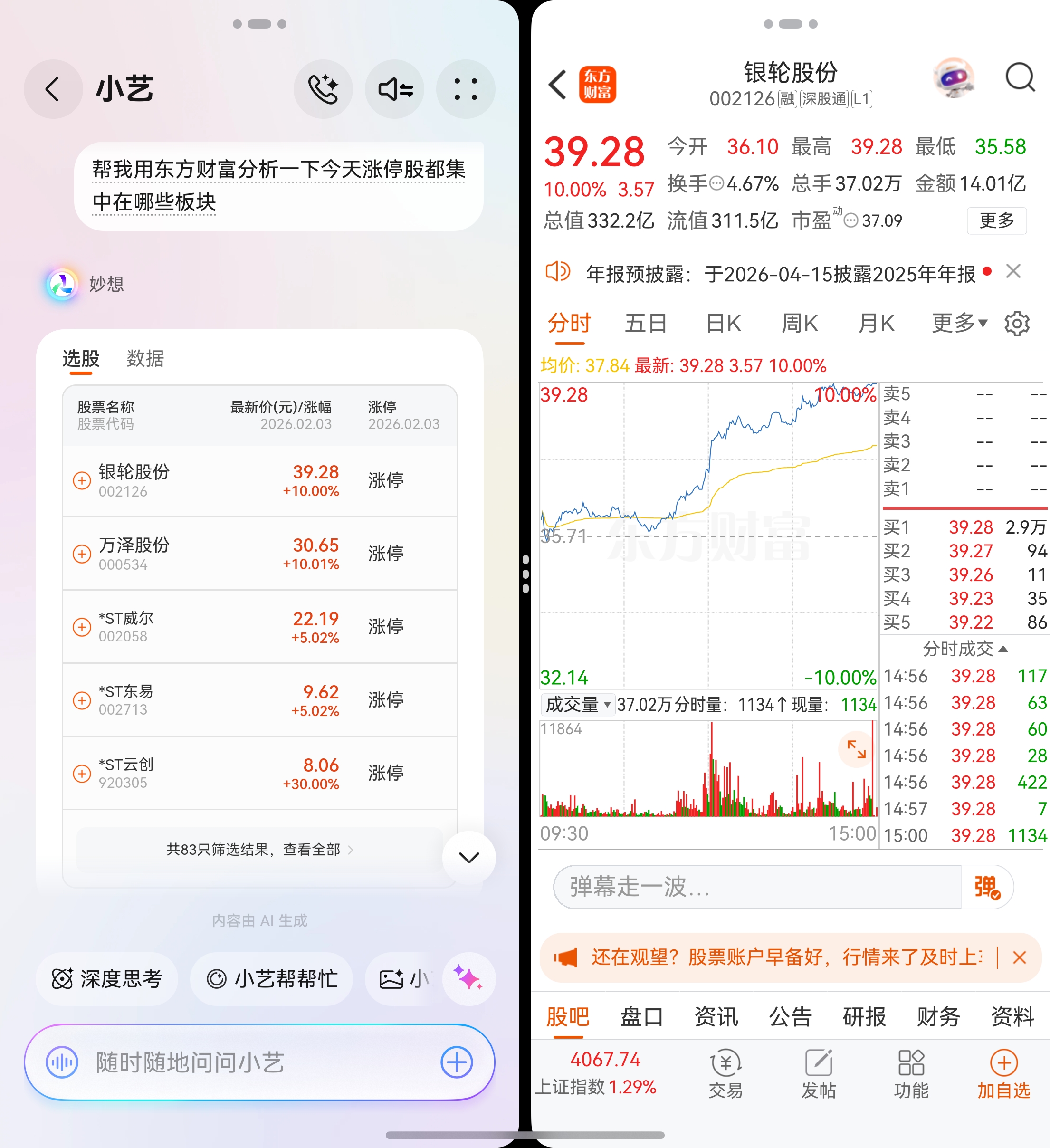 得益于双折叠屏手机开阔的视野和独特的双屏交互,投资者可以通过小艺语音助手唤起“妙想智能体”进行股票查询,轻松实现“左侧问股、右侧交易”的便捷操作。例如,用户只需对小艺说“用东方财富帮我看一下今天涨停股集中在哪些板块”,小艺便会通过智能体列出相关板块及涨停情况;点击任意板块,右侧屏幕即可直接跳转至该板块的行情页面,而左侧屏幕仍可继续交互,供投资者进一步提问。这样一来,以往需要在多个设备或应用间反复切换的操作,如今只需在掌上方寸之间轻触屏幕,便能从容实现边查询边交易的一体化体验。