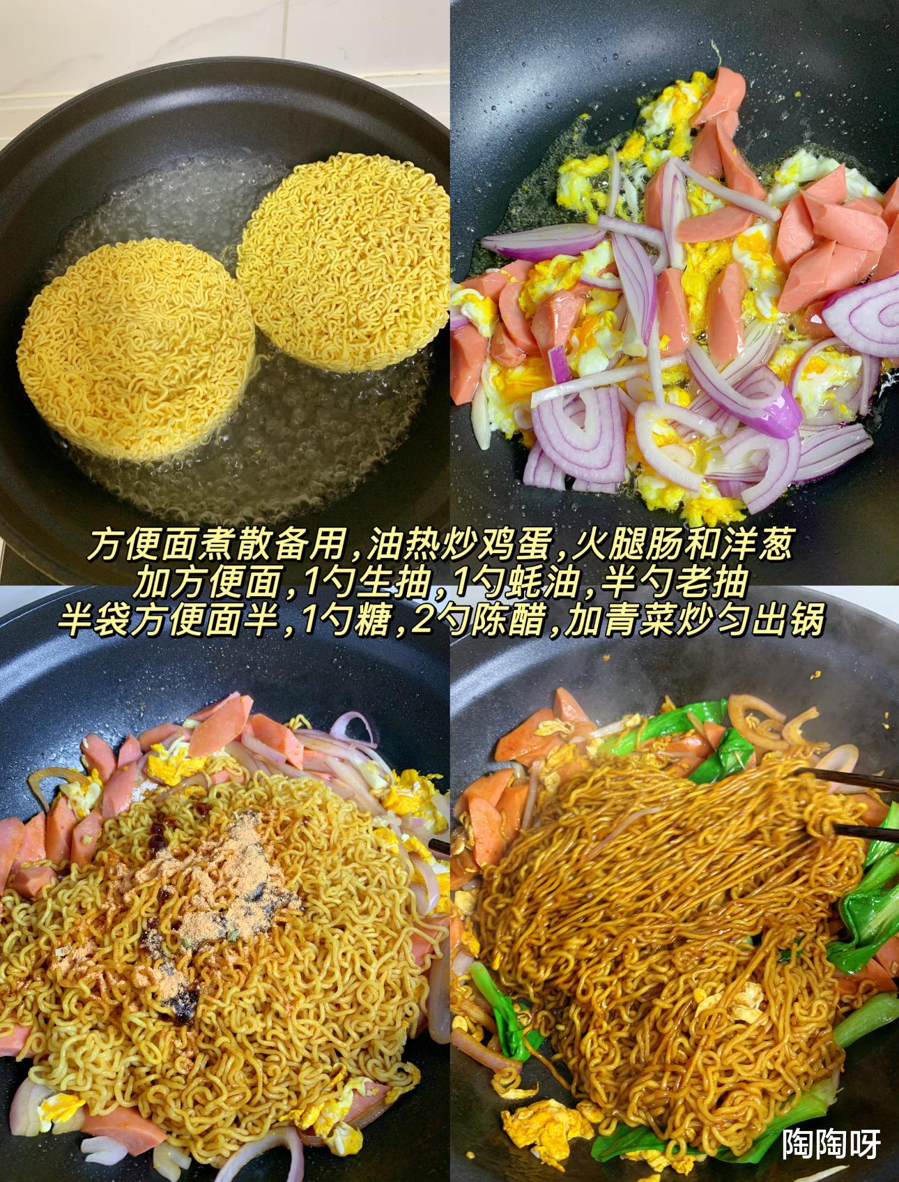- 倒入方便面,加入1勺生抽,1勺耗油,半勺老抽,半袋方便面粉,1勺白糖和2勺陈醋,翻炒均匀。