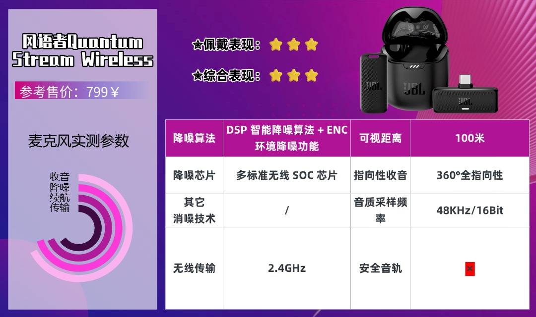 它有自研的鲸语Comm通信技术,采用抗干扰的跳频算法,在没有遮挡的情况下,250米内都能稳定传输,就算隔着3堵墙,也不会断连、卡顿,比那些宣传能传百米、实际不到50米就断连的普通麦克风靠谱多了。不管是大型活动直播跟拍,还是户外探店移动收音,信号都很稳定。另外,它还有三重防爆音专利,通过优化声学结构、压制声音峰值、修正声音波形这三种方式,彻底解决了近距离说话、咳嗽时出现的刺耳杂音,不用再担心炸麦的问题。