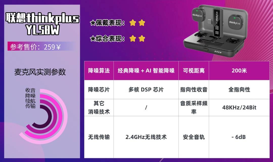 联想thinkplus YL58W是一款高性价比基础款无线麦克风,针对多设备干扰问题优化2.4G传输模块,保障信号稳定无杂音。360°全指向拾音单元人声还原度满足基础创作需求,短距离传输延迟低,适合日常短视频、口播拍摄。双重降噪对轻微杂音过滤效果好,但户外大风天气降噪能力不足,无高级功能加持,且不支持立体声录制,声音空间感较弱。机身设计简约精致,无廉价塑料感;操作便捷,开机自动配对,无需复杂设置。续航能力充足,可支撑全天短视频拍摄,但机身重量略高,夹戴时间久了会有不适感,预算有限的新手选择这款准没错。