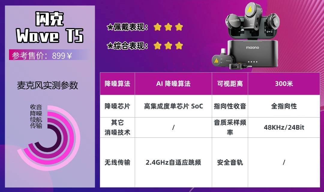 闪克Wave T5是一款专业级中端无线麦克风,24Bit录音棚级采样技术让音质达到超CD级水准,细节丰富,层次感强;最大支持120dB声压级录制,大声喊话也不会炸麦。“音盾”AI降噪技术对户外车流、人群等杂音过滤效果好,风噪抑制能力出色,大风天气无需额外配件。2.4G数字跳频技术保障信号稳定,充电盒兼具收纳与补电功能,携带方便。专业用户可通过APP精细调整降噪和音量参数,精准适配不同拍摄场景;美中不足的是按键容易误触,且APP仅支持部分系统,兼容性有待提升,机身重量略高,长时间佩戴有下坠感。性价比突出,适合追求专业音质的中端用户选择。