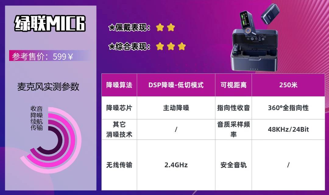 绿联MIC6是一款注重细节体验的无线麦克风,48kHz/24Bit高规格采样搭配双线电容咪头,人声还原度达90%,声音富有层次感,多人拍摄时每个人声音都稳定清晰。独创DSP降噪低切模式对低频杂音过滤效果好,录制音频无需后期处理;250米内信号传输稳定,适合双人合拍、户外移动拍摄,户外大风天气需搭配防风配件。设备支持一拖二模式,小团队创作无需额外购买麦克风,节省成本;接收器高清彩色屏幕在强光下可视性强,按键反馈清晰,操作便捷。机身采用磨砂金属背夹,结实耐用,跑跳拍摄也不会掉落,细节做工精良;但机身重量较重,长时间佩戴会有明显下坠感,且价格略高于同配置产品,适合注重使用体验的用户。