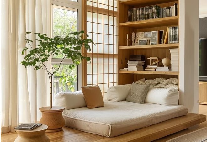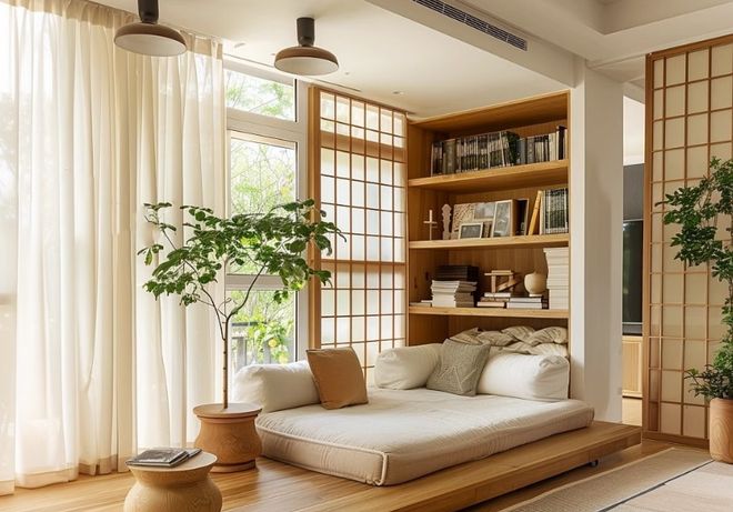那么我们可以在采光比较好的窗户边,例如客厅或者是卧室的窗户边打地台,或者也可以打造卡座,或者是简单放置休闲椅与小边几。